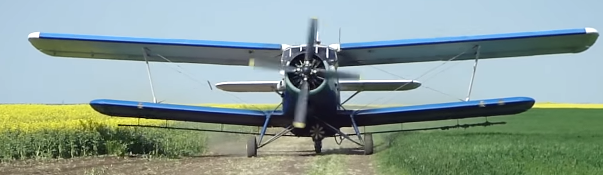A manned Antonov An-2 landing after a crop-dusting run in Romania, piloted by one Bogdan Martin. Source: sklembe, on YouTube