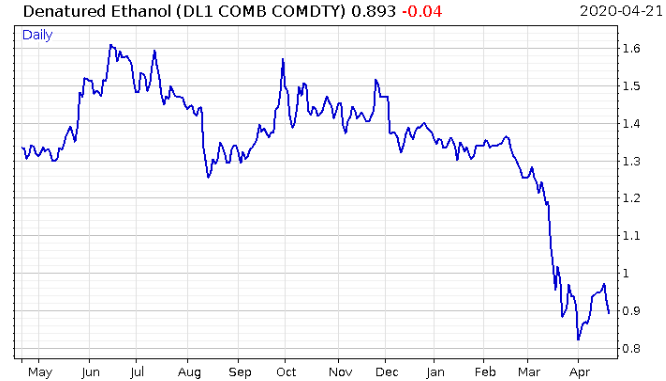 With nobody driving around right now, the wholesale price of petrol has got whacked, though we’re (somewhat sadly) not anywhere near a scenario where we’ll get paid to fill up jerry cans at the pump. This lack of demand for fuel has accordingly led to the price of ethanol getting whacked too.