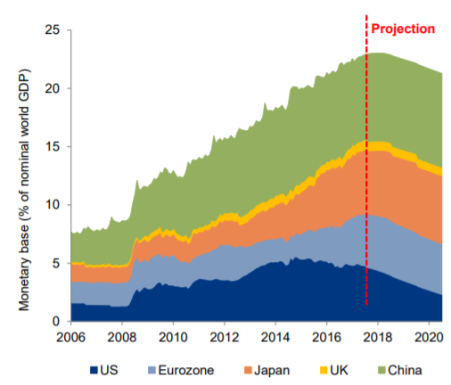 This chart shows how central banks in the world put together will begin reversing QE this year, something pundits are calling quantitative tightening (QT).