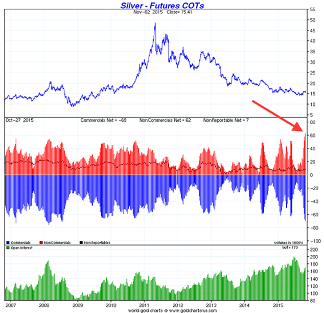 (For those that have an interest in these things, the chart below, courtesy of Nick Laird over at Sharelynx, shows the COT positions. I have drawn an arrow pointing to the current long position of the large speculators.)
