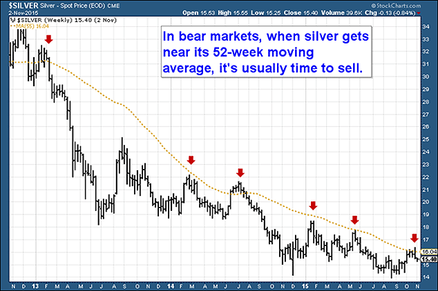 That average is trending down, and the silver price has consistently failed to break above it. Once or thrice a year, silver has been able to rally up to it, only for that rally to run out of steam.
