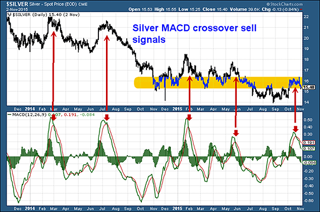 And just as silver was running into that resistance, we got a “MACD sell signal”. MACD is a technical measure of momentum. Look at the bottom half of the chart below.