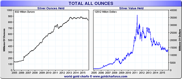 Courtesy of Nick Laird once again, we see on the left the amount of silver held. And on the right, the value of that silver.