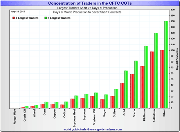 Silver has the largest concentration of short positions of any commodity (in other words, some people have placed big bets on the price falling – see the chart below from Nick Laird at Sharelynx). To cover those short positions (in other words, buying back enough metal to close down the shorts) would require more days of production than any other commodity.