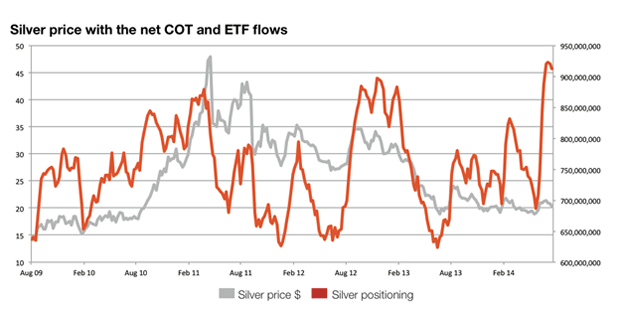 The silver line shows the silver price, while the red line shows the ‘net length’.
