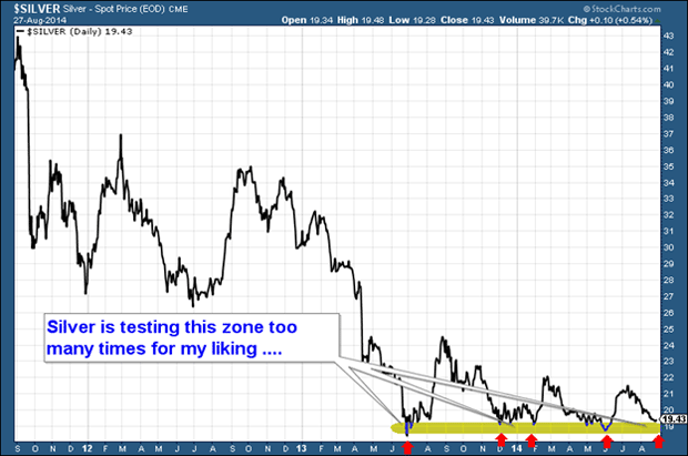 In this case, silver is retesting that key support just below $19 too many times for my liking. I’ve illustrated it in the chart below. Will that amber band hold this time around?