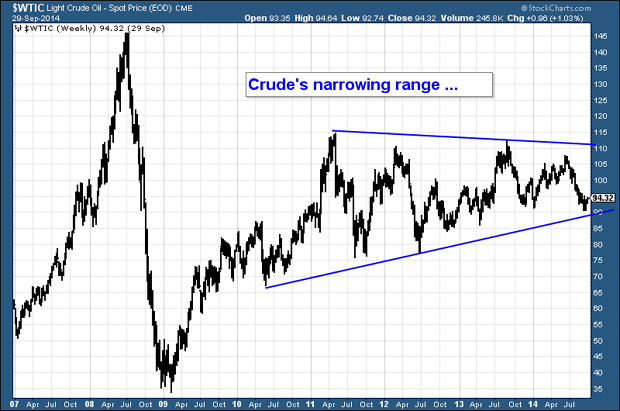 In the volatility of 2008 we saw a $112 (!) swing from the $147 high to the $35 low. But since then, oil’s story has been one of an ever-narrowing range and declining volatility.