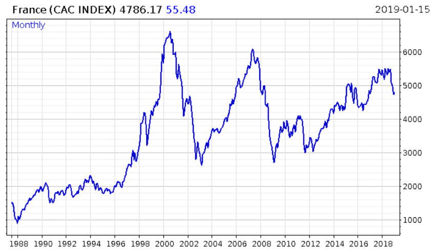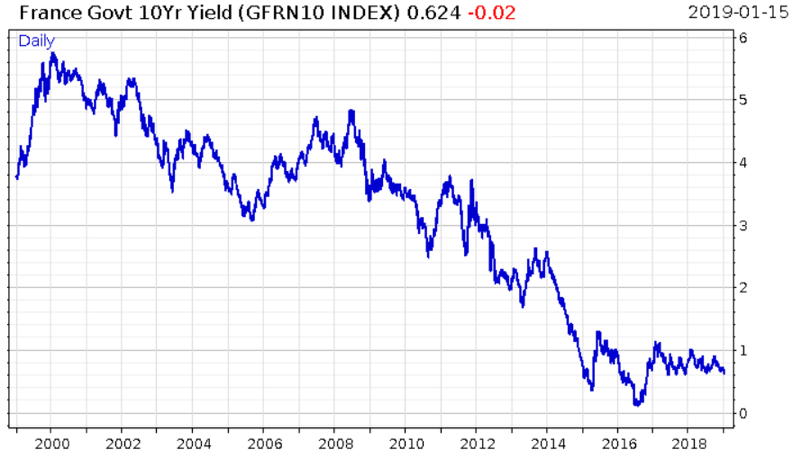 … by which I mean, at least you didn’t buy the French stockmarket at its millenium peak. The poor bastards who did that have been submerged ever since and didn’t even see the sunshine during the boom before the financial crisis. The yellow vest protestors have no doubt added to the grief of the passive French stock investor. But interestingly, not to the French bond investor…
