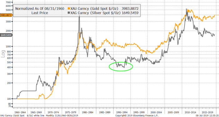 Source: Bloomberg –gGold (gold) and silver (grey) since 1960 in USD terms rebased
