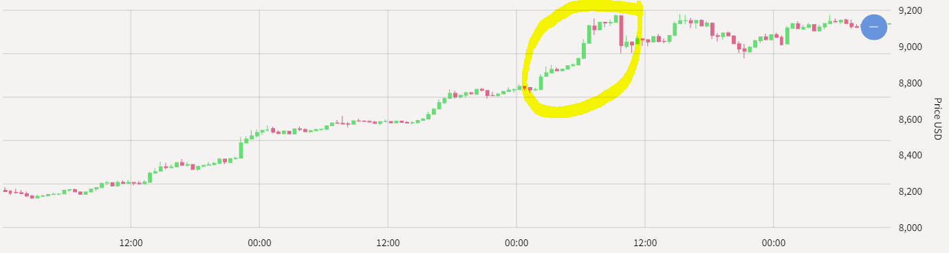 The sudden jump may have been the work of a single wealthy individual or “whale” in the market, who aggressively bid up prices, knowing that others would buy BTC after it passed the psychological $9k level. The whale then dumped all of the coins they just bought on the new buyers at prices they themselves inflated – indicated by the large red candle in the highlighted section, which took place over just half an hour.