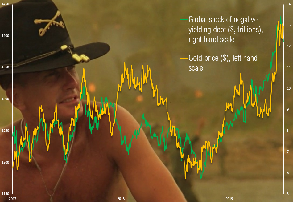 The negative-yielding debt pile is set to grow strongly for the time being, and the price of gold with it – for why would own an asset that pays a negative yield, when you could own one that pays zero? I know which I’d rather have. As fund manager Daniel Lacalle recently wrote: