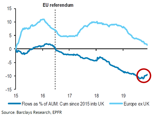 Fund managers are only just buying Britain again, and their stacks of UK assets are still way smaller than they were in 2016. Note how the dark blue line (flows into the UK) has only just begun ticking back up: