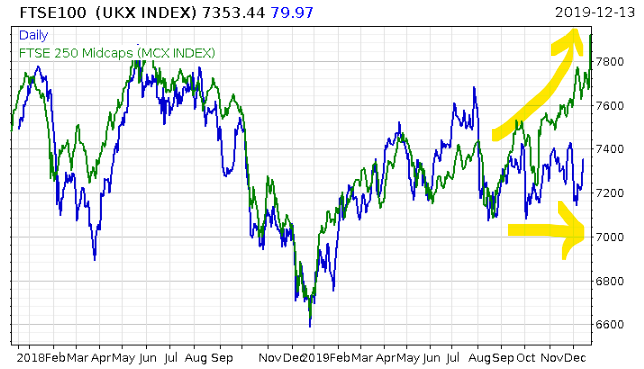 And that’s why if you want to ride the great returning wave of capital returning to the UK, you should stick to that green line on the chart: the lesser-known FTSE 250. These are smaller British stocks more focused on the domestic UK economy, with less foreign earnings. As a result, a stronger pound has less of a dampening effect on their performance, or even increases if any imports or foreign services they buy cheaper.