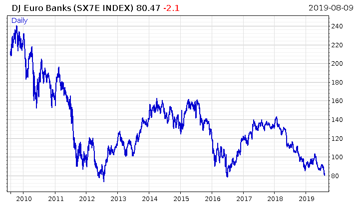 In effect, this bull run in the European bond market may actually be a continental bank run in disguise. This stress may be being hinted at in the stockmarket, as nobody wants to own European bank shares. European bank shares are getting pounded to levels not far from the depths of the sovereign debt crisis.