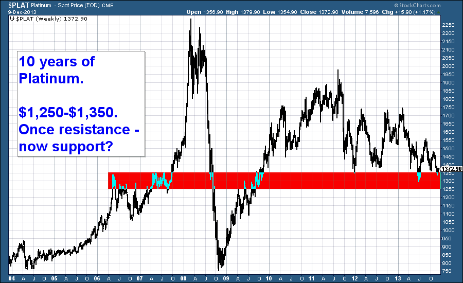 Below we see the platinum price since 2004. I have drawn a red band across the $1,250-$1,350 price area which was resistance in 2006-7 on the way up, and has provided some support on the way down.