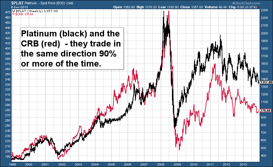 Here’s a 15-year chart that shows platinum in black, and commodities as measured by the CRB index (so that includes grains, softs, metals and energy) in red. You’ll notice that the two trade in the same direction almost all of the time.