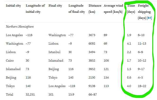 These are just estimates on paper, but look at its estimates of how long it would take to transport goods over the jet stream in massive airships, relative to freight shipping on the far right: