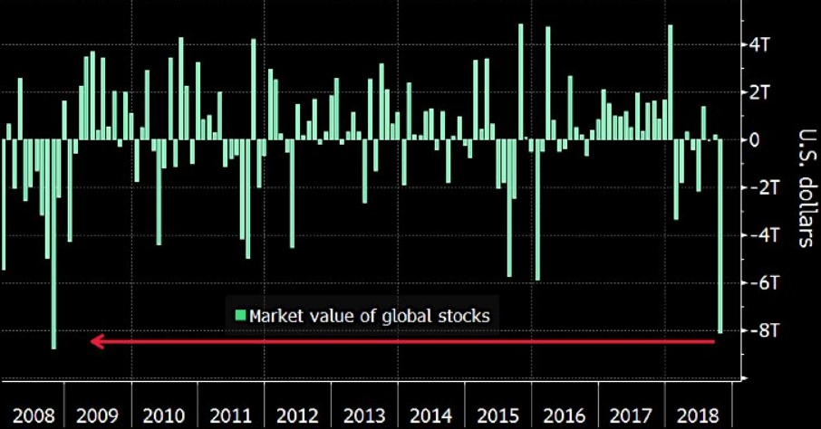 October wiped out almost all of 2017’s gains in dollar terms based on a Wall Street Journal estimate. The loss is also worth about 10% of 2017’s global GDP according to the World Bank.