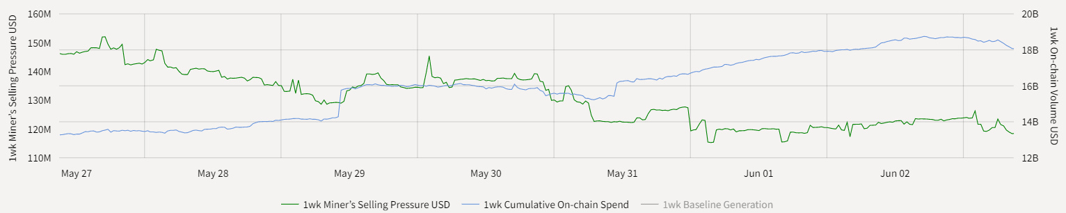 Though BTC price has taken a clip to the chin this morning, the “fundamentals” (if we can call them that) of the Bitcoin network are looking positive. The miners have been reducing their selling over the last week, and the network spend is on the up. By “spend” I mean the value of BTC being transacted across the network – effectively how much life there is in this digital ecosystem: