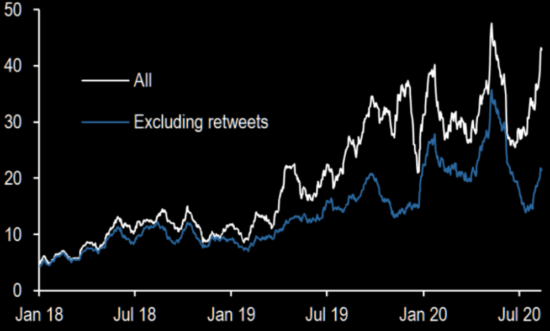 We’ve explored Trumps creative use of Twitter to bypass the media in this letter before (WHERE ARE THE CENTRAL BANKS?! – 22 August 2019). It’s hard to conjure dozens of original tweets of your own every day, let alone in such a persuasive style while doing “the most important job in the world” etc. The man is clearly a talented content creator, expressing a gift you’d normally find in millennials and the even younger “zoomer” generations who are native to the internet.