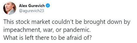 But to my eyes, any correction here instilled by a pandemic panic – provided it can be contained, and that we’re not all goners – will simply be an intermission before the melt-up resumes.