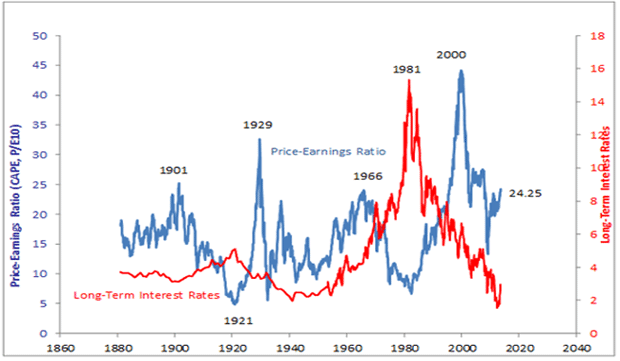 Cyclically adjusted p/e for the US stock market, and long term US interest rates
