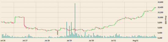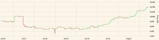 But gold isn’t the only fringe asset that’s taking off. Bitcoin, even further out in the investment bush, is back above $10k once more: