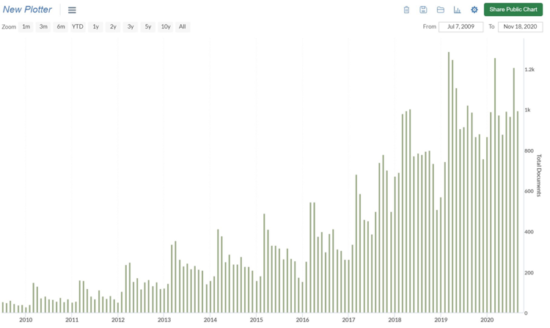 That, my dear reader, is usage of the word “visionary” in corporate filings over the last decade.