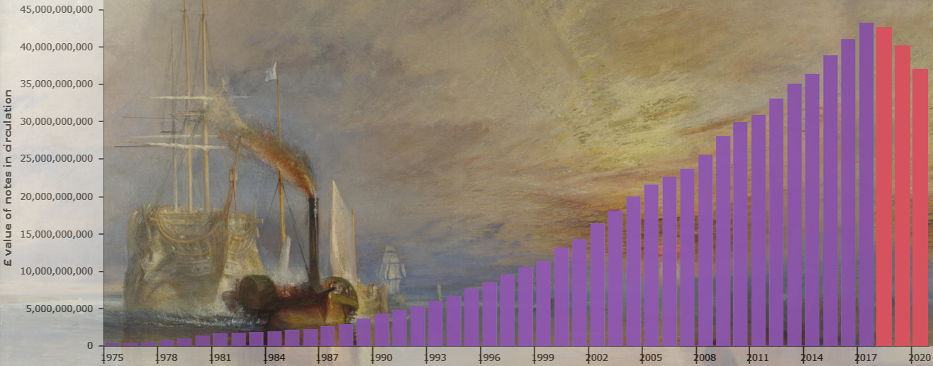 By the time The Fighting Temeraire arrived, the tide for twenties was already going out. Twenties are key, as they’re by far the most popular pound note in both value and absolute number of notes in circulation. The lack of demand for physical cash is also illustrated by the decline in ATMs, with the number of free-to-use ATMs declining by 13% last year.